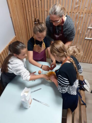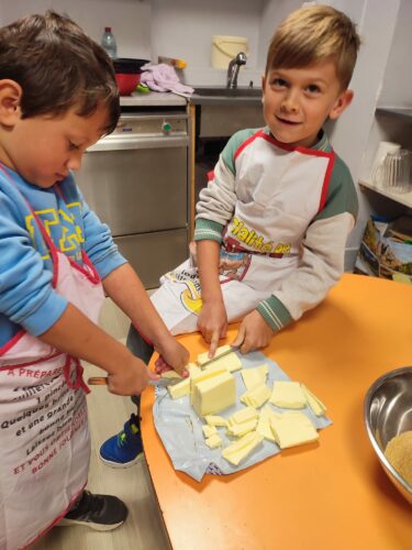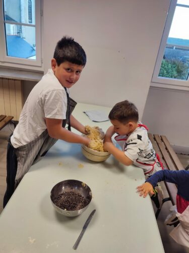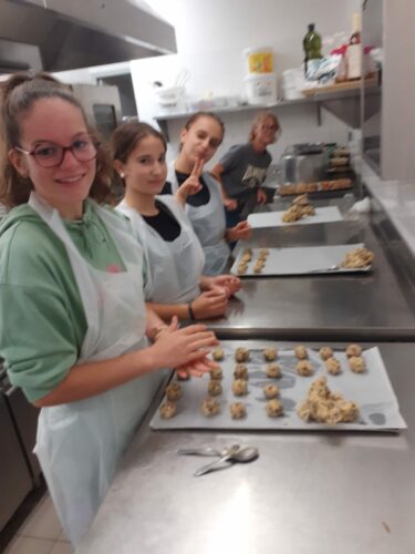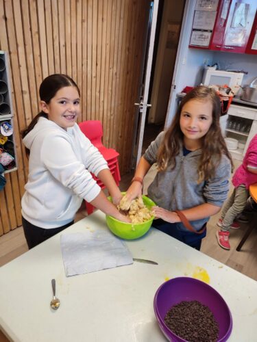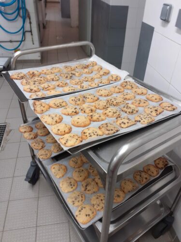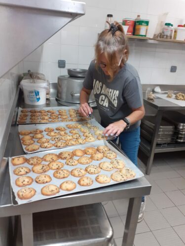 Puis, est venu le moment tant attendu : la confection des cookies ! Vu la quantité à produire, les mots d’orde étaient rigueur, concentration et efficacité ! Comme dans une grande cuisine, avec une armée de petites mains, sous les ordres de cheffes Myriam et Christelle !