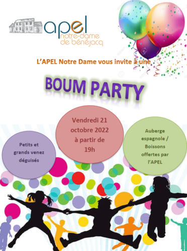 Soirée Boum organisée par l’APEL le 21 octobre 2022 à 19h Oct 4,2022 Commentaires fermés sur Soirée Boum organisée par l’APEL le 21 octobre 2022 à 19h Plus de renseignements très prochainement dans les cahiers de vos enfants !