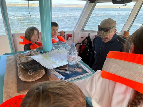 Les enfants observent, visitent. Et le capitaine nous explique beaucoup de choses sur l’océan, la Dune, l’île aux oiseaux et les maisons tchanquées. Certains enfants se sont même essayer à naviguer !